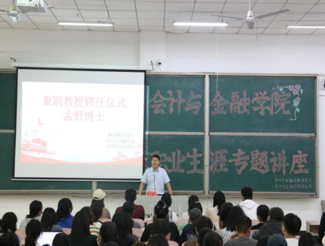 9月28日下午,会计与金融学院邀请孟野博士做职业生涯规划专题讲座并举行客座教授聘任仪式。中天远大餐饮集团吴妍霏主任、会计与金融学院党总支书记曹钊庆、全体辅导员以及各年级学生代表参加本次活动。