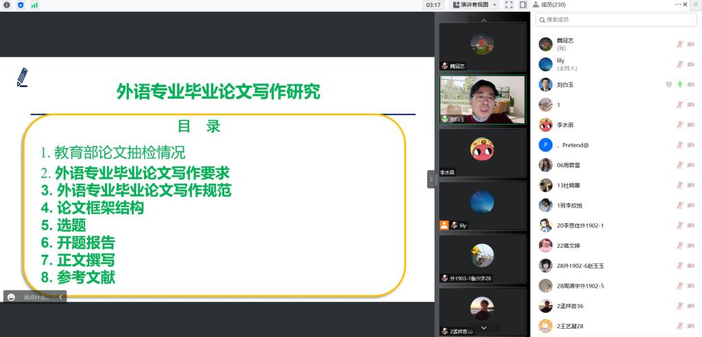 为学习贯彻由教育部出台的《本科毕业论文抽检办法(试行)》文件,认真做好2019级毕业论文选题及各项指导工作,外国语学院于11月2日在线上举行了2019级毕业论文写作指导讲座。讲座由院长助理张丽主持,院长刘白玉教授担任主讲人,2019级全体学生及论文指导教师参加了本次讲座。